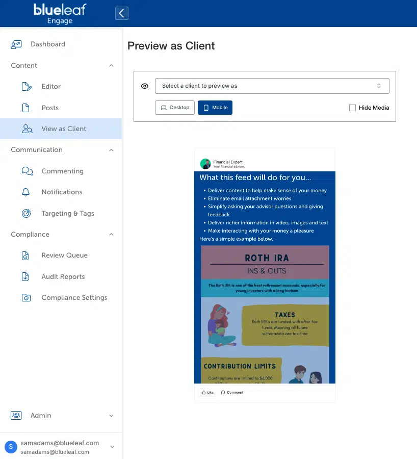 Meanwhile, you, as the advisor, control content targeting and distribution. You decide which clients get which content based on their needs. Retirees get different content than accumulators, and high-net-worth clients get different planning insights than mass affluent. That’s your expertise, your value-add.