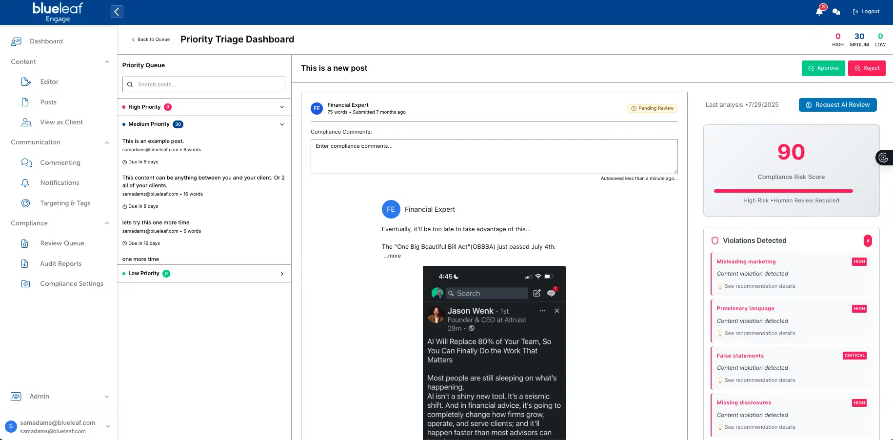 The compliance piece alone is worth the price of admission. Instead of emailing drafts back and forth, wondering if compliance actually reviewed something, or scrambling six months later to prove what you sent, it’s all handled in the workflow. Content goes through your compliance process. Everything’s documented. You can sleep at night.